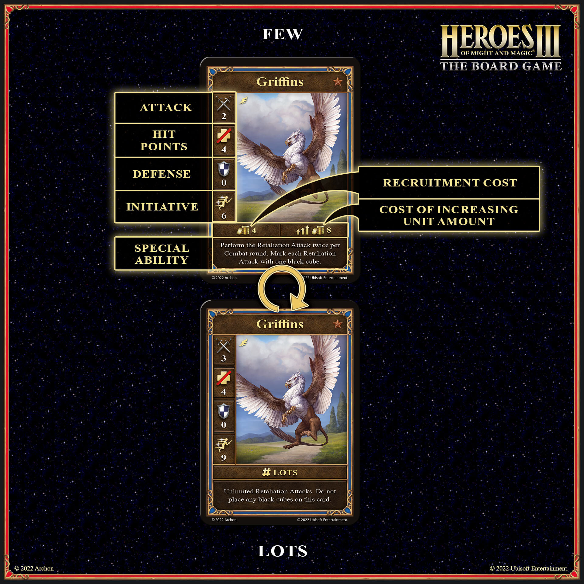 At the bottom of the unit card, you can find recruitment costs - how many resources you need to spend to add a unit to your army or to increase the size of its squad. In Heroes of Might and Magic III: The Board Game, the unit cards are double-sided. One of the sides shows a given unit in the range of a few, and the other side in the range of lots; so when a unit's hit points in the range of lots are reduced to 0, it does not leave the battlefield - its card is flipped so that it can continue combat - but from now on in the range of a few.