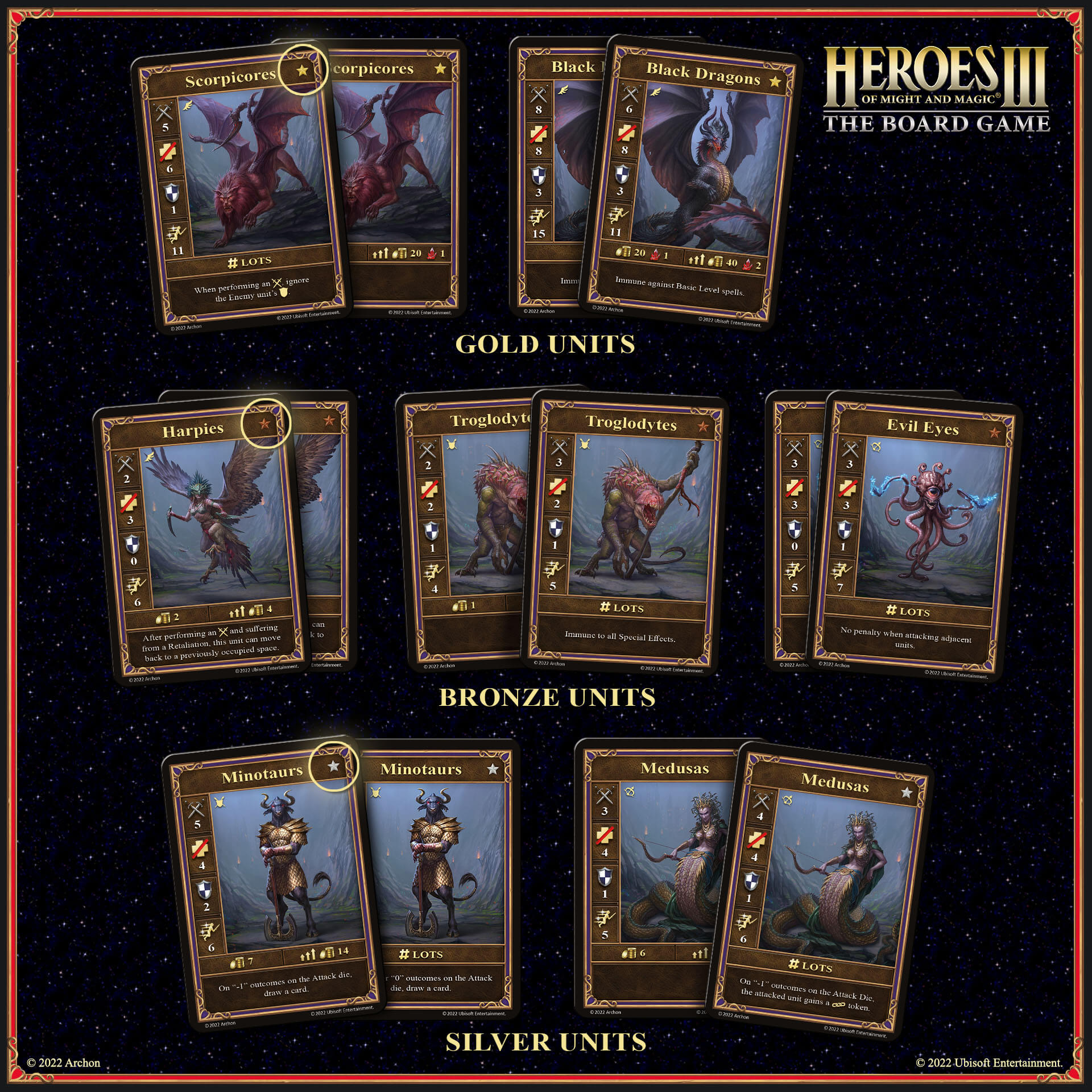 As with the other core mechanics of the original, we tried our best to bring them into the board game. Of course, this required some simplifications and efforts to keep the game smooth and exciting. Yes, in the board game, each faction has 7 units available in the town, but, like in Heroes of Might and Magic I, the Hero can only recruit 5 of them. We have changed the levels of units (and their dwellings) to the following groups: bronze (levels 1-3), silver (4-5), and gold (6-7)... Mighty dragons, in honor of the most powerful creature in Antagarich, we have marked with azure.