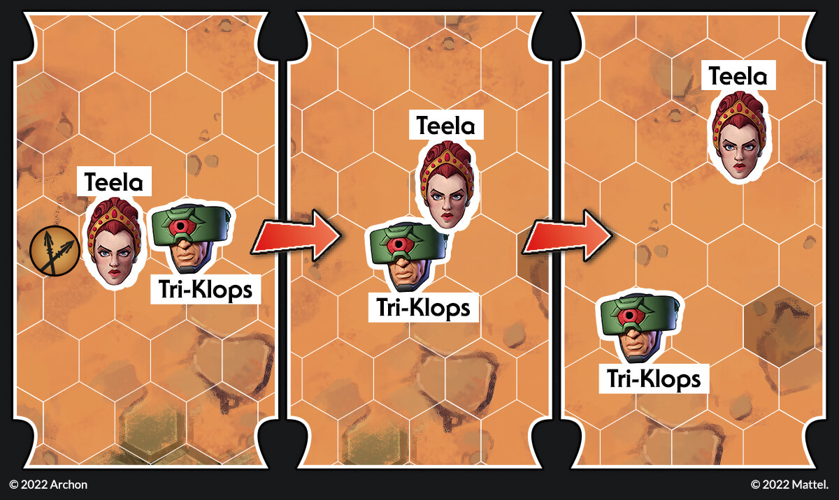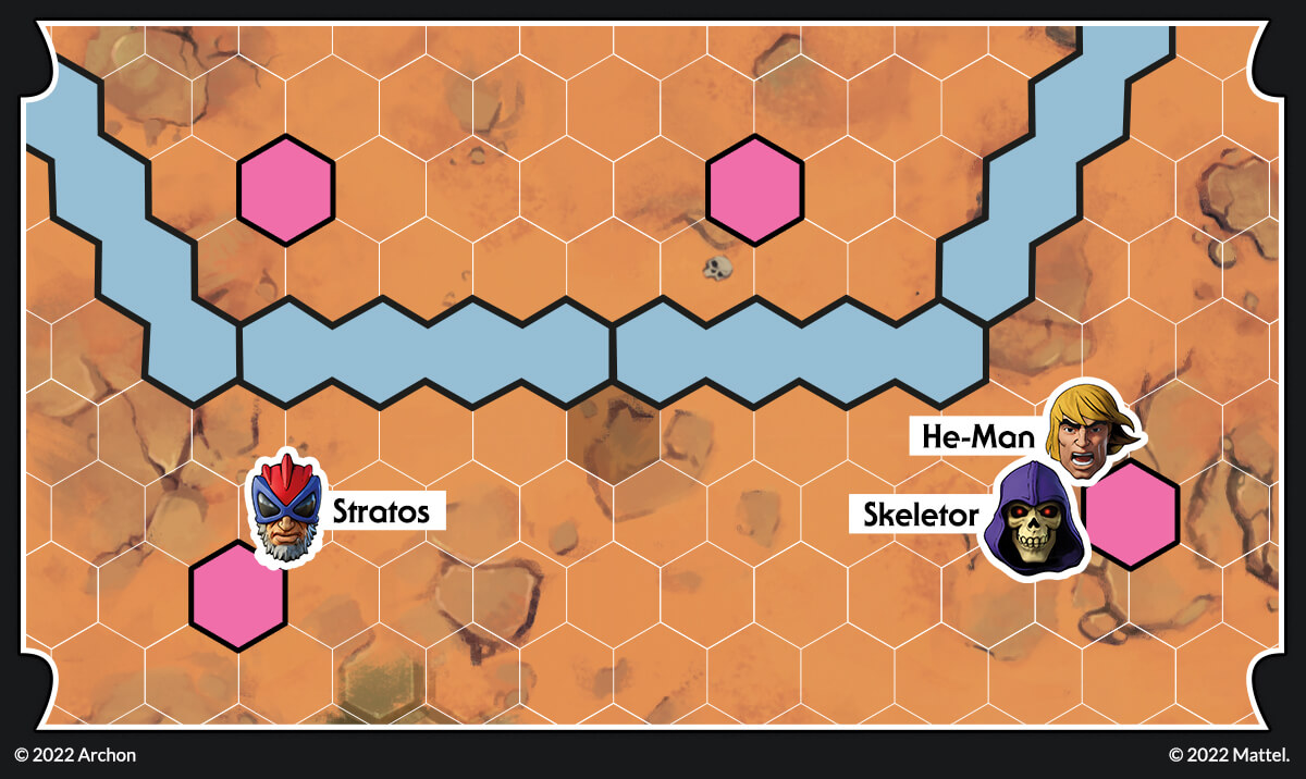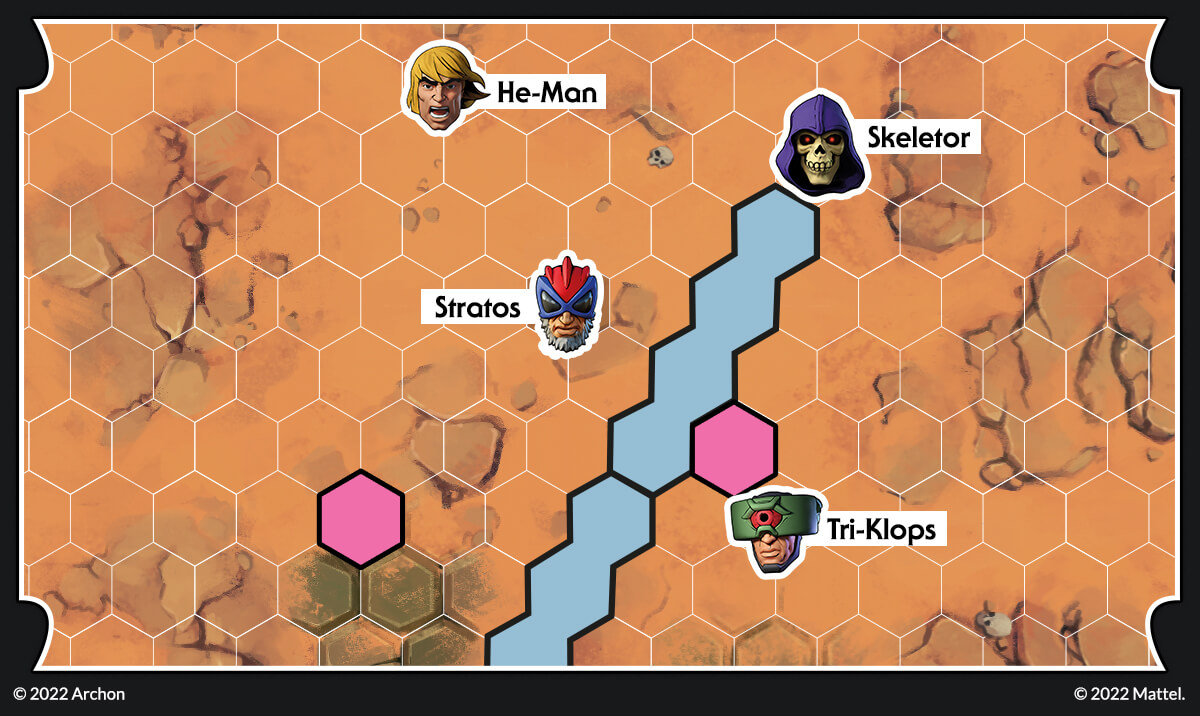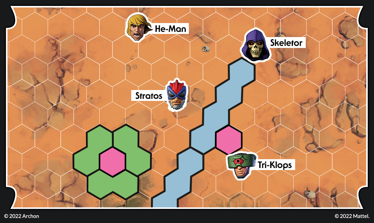 Let’s imagine the following situation. Skeletor has placed two teleporters; at the beginning of the next round, Tri-Klops should be able to engage Stratos easily. This cannot be! He-Man can move towards the teleport and destroy it, but then he won’t be able to engage Skeletor! Fortunately for He-Man, there is a better solution.
