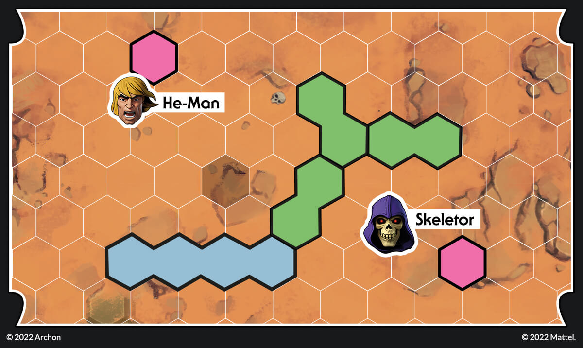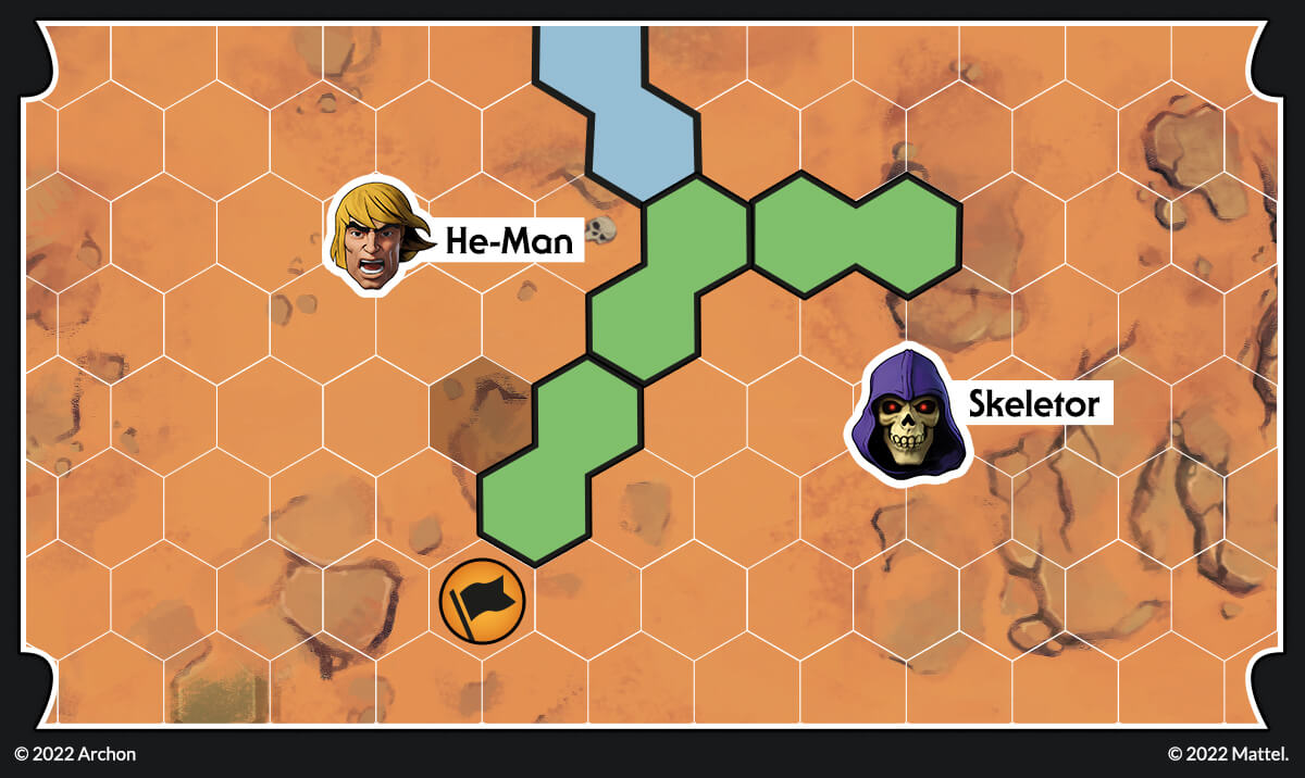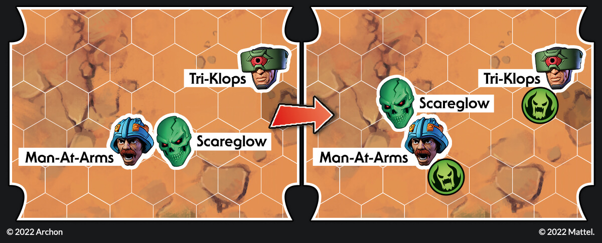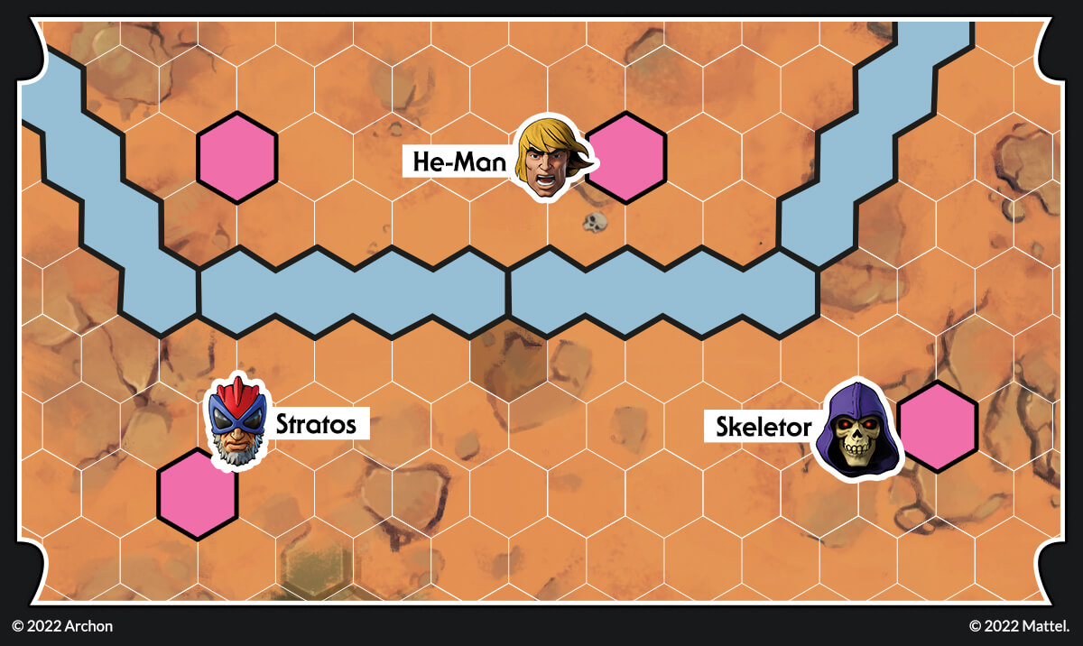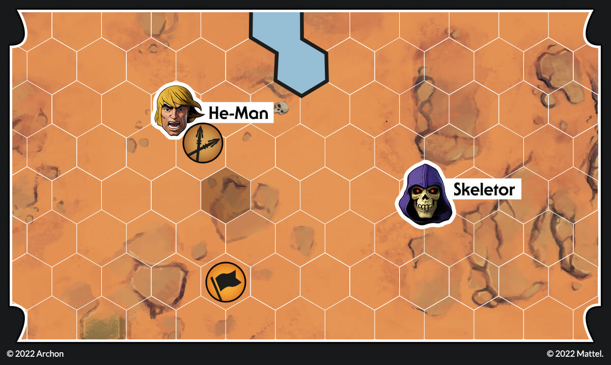 Let’s imagine the following situation. Skeletor has placed two teleporters; at the beginning of the next round, Tri-Klops should be able to engage Stratos easily. This cannot be! He-Man can move towards the teleport and destroy it, but then he won’t be able to engage Skeletor! Fortunately for He-Man, there is a better solution.