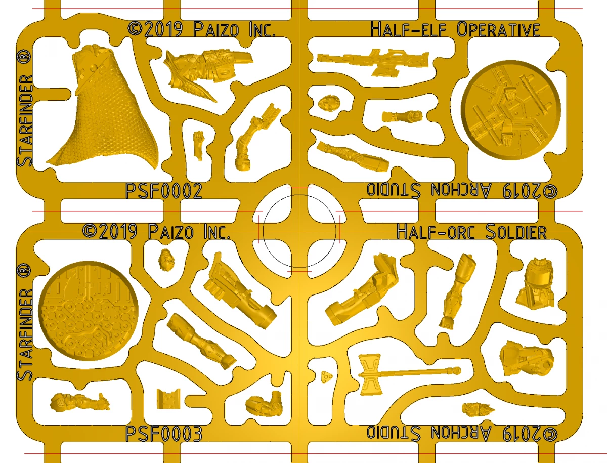 Additionally, each Starfinder character will come with a scenic base, that will help to make your miniatures pop when on the tabletop. Here you can see a render of the sprue layout as well as the tools that are being used to print the awesome hard plastic sprues. Each sculpt is digitally cut up and segmented on the sprue layout, which is then explicitly optimized to fit the most amount of plastic components on each sprue.