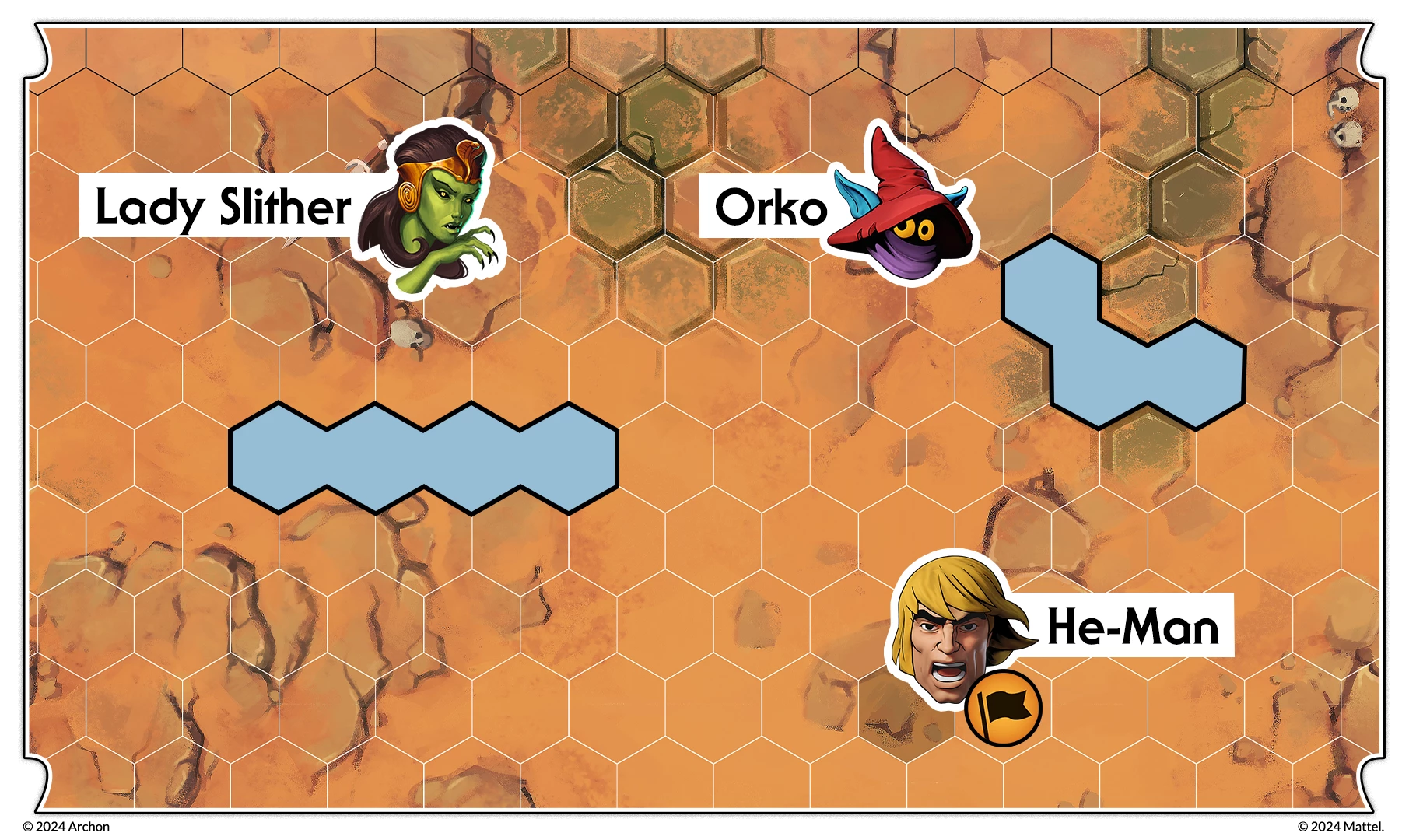 The opponent anticipates Lady Slither next to the objective token and positions He-Man to intercept her. However, they made a mistake. As the round drew close, Lady Slither materialized on the alternate mark, catching Orko off guard!