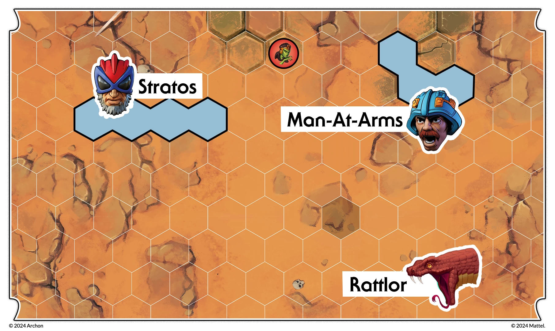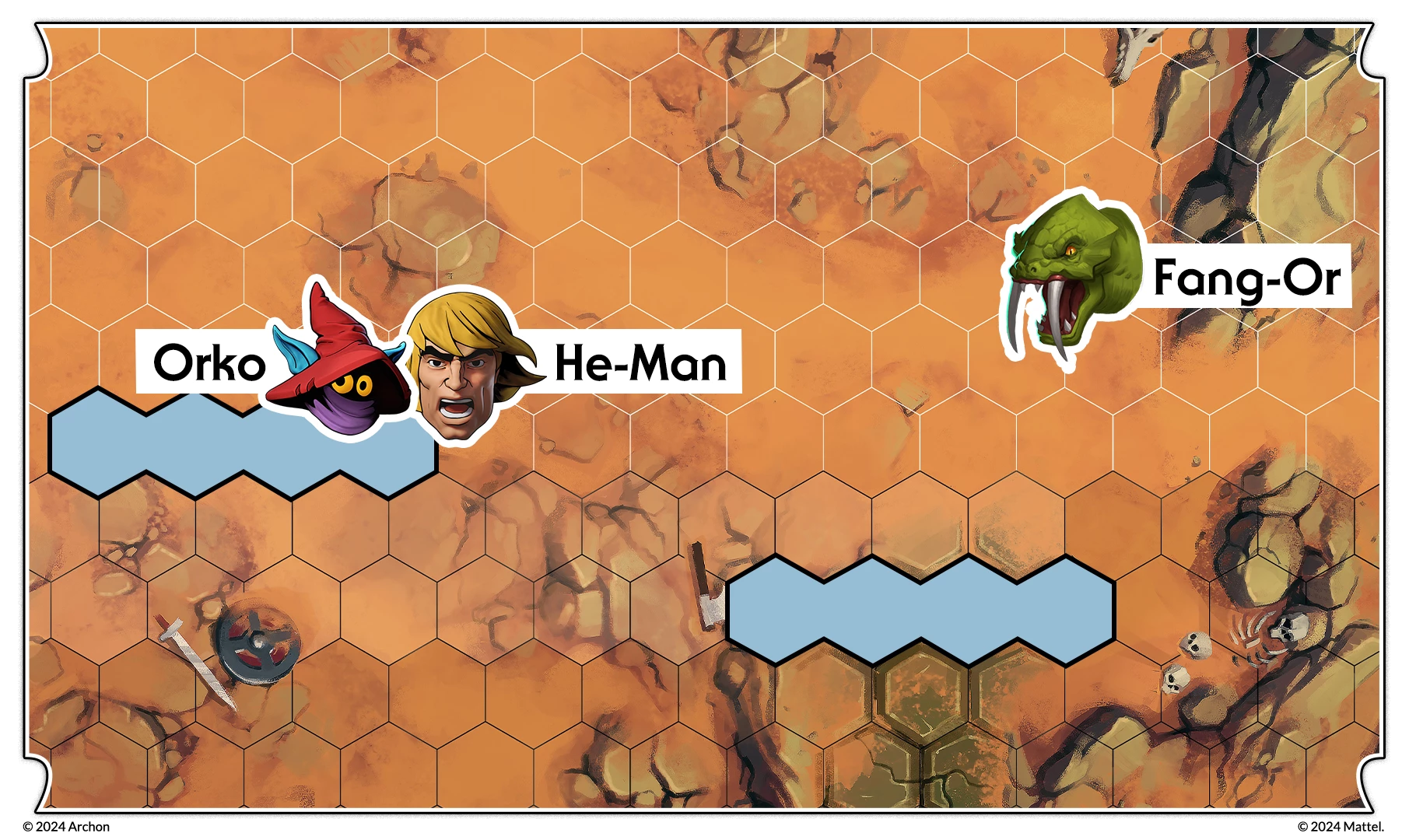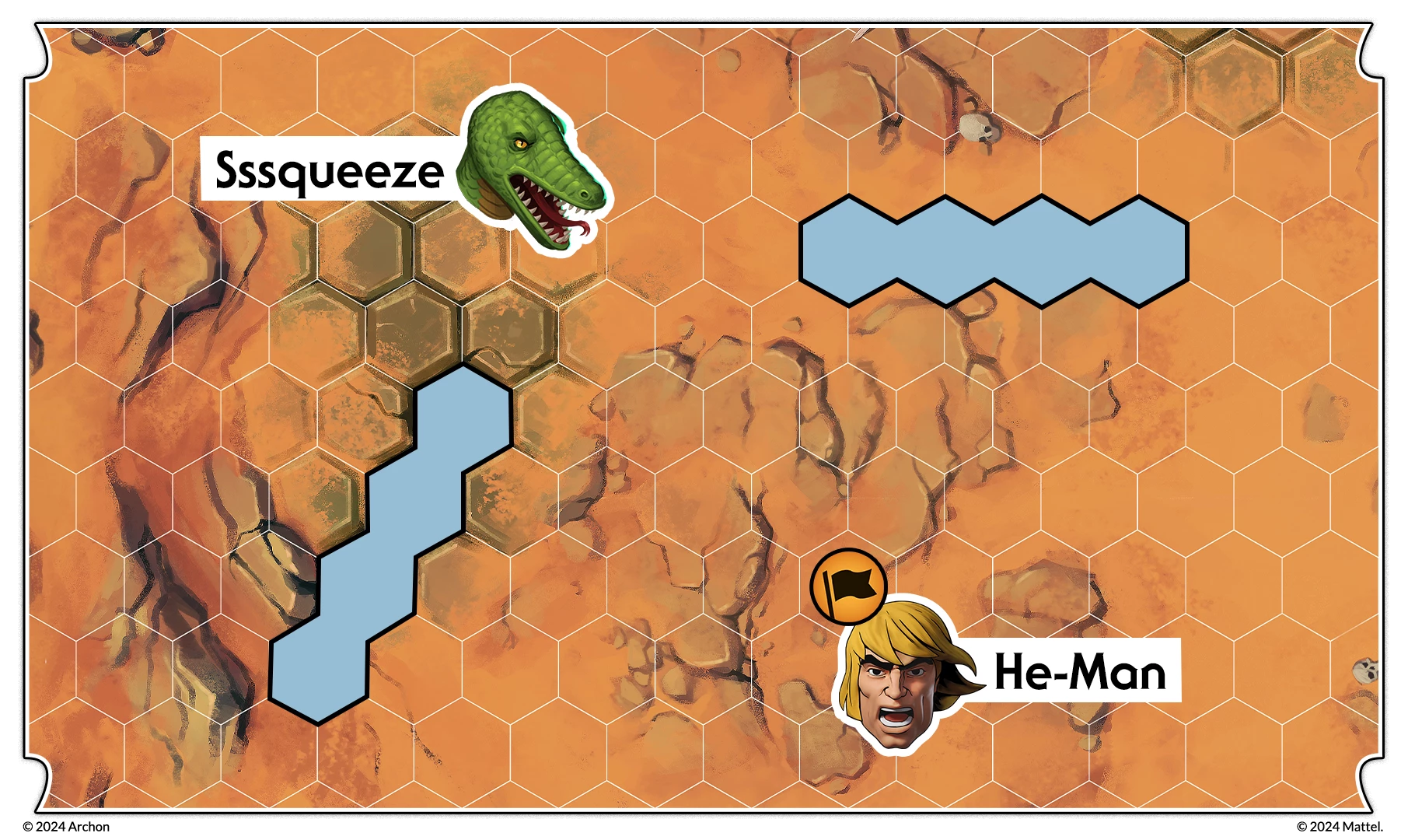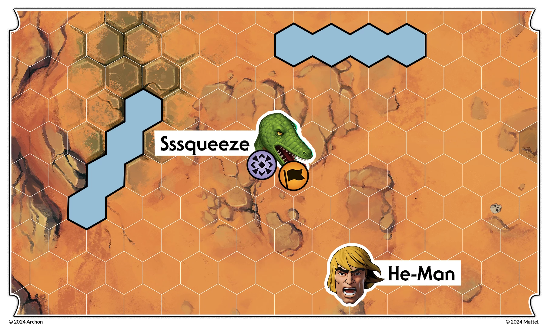 Sssqueeze strategically positions himself two hexes away from He-Man, attacking with his mace, forcefully pushing back the mightiest man in the universe. Now, he braces himself for the inevitable retaliation. Thankfully, Sssqueeze can regenerate focus, allowing him to capitalize on the power of the mace multiple times per round!