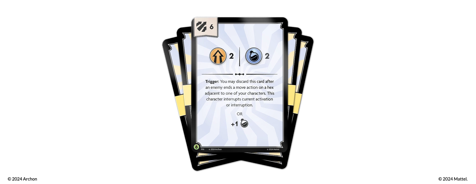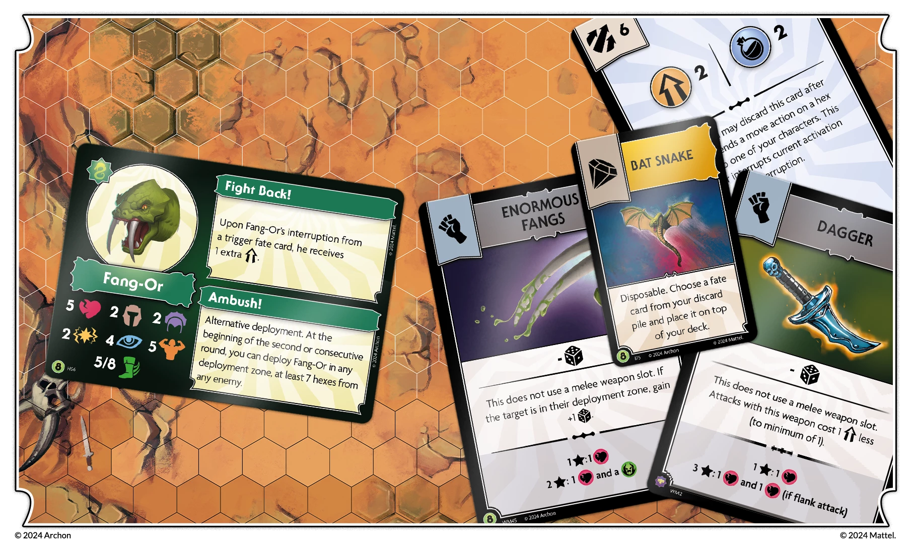 Fang-Or uses a trigger card to interrupt He-Man. First, he strikes with his enormous fangs, then follows up with a dagger thrust. Despite He-Man's retaliatory strike, the battle is far from over. Fang-Or will continue the onslaught during his activation! Should He-Man fall, Orko is next!